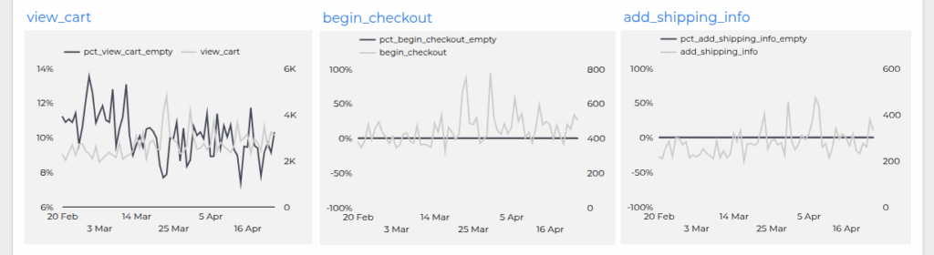 itempayload (should be a flat zero % line) – except maybe forview_cart - number of hits for this event